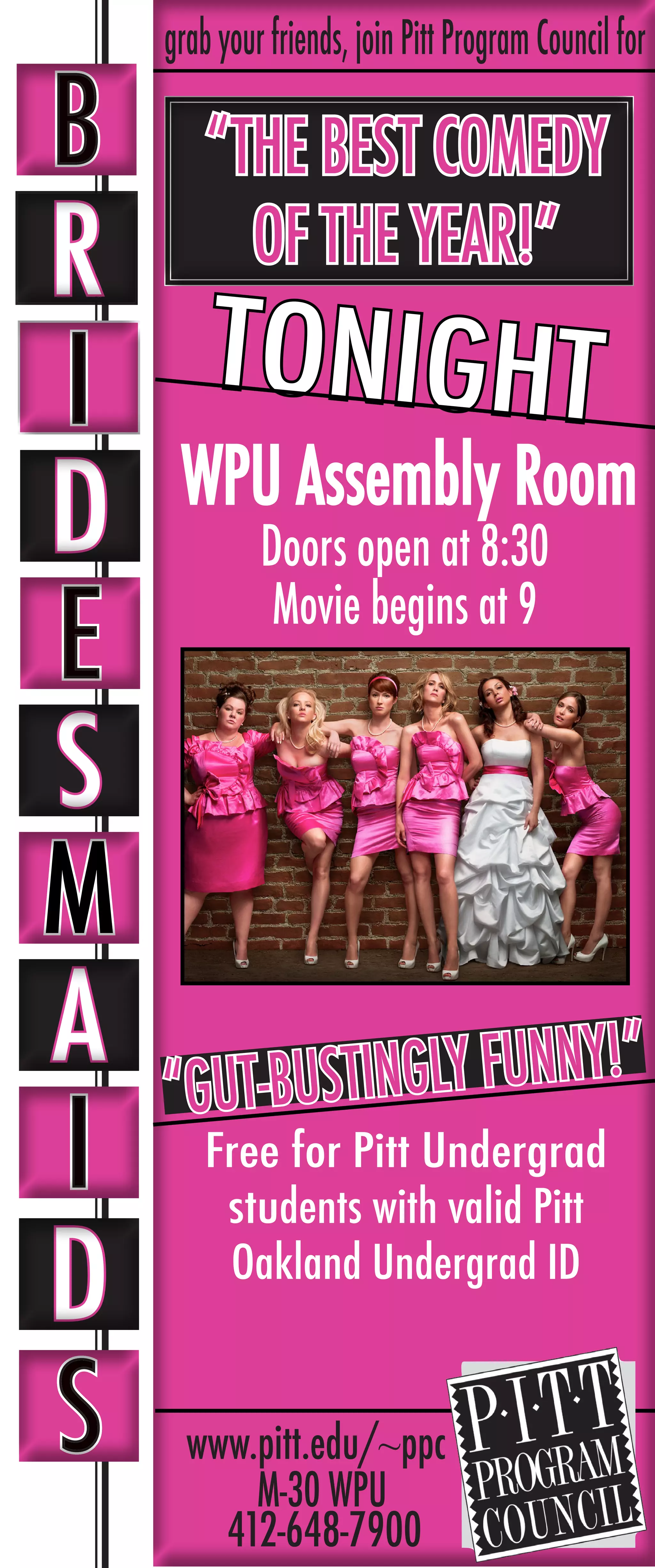 The Pitt Program Council is hosting a comedy event tonight at 8:30 PM in the WPU Assembly Room, with the movie starting at 9 PM. It's free for Pitt undergraduate students with a valid Oakland ID. The event promises to be 'gut-bustingly funny' and is touted as 'the best comedy of the year!'