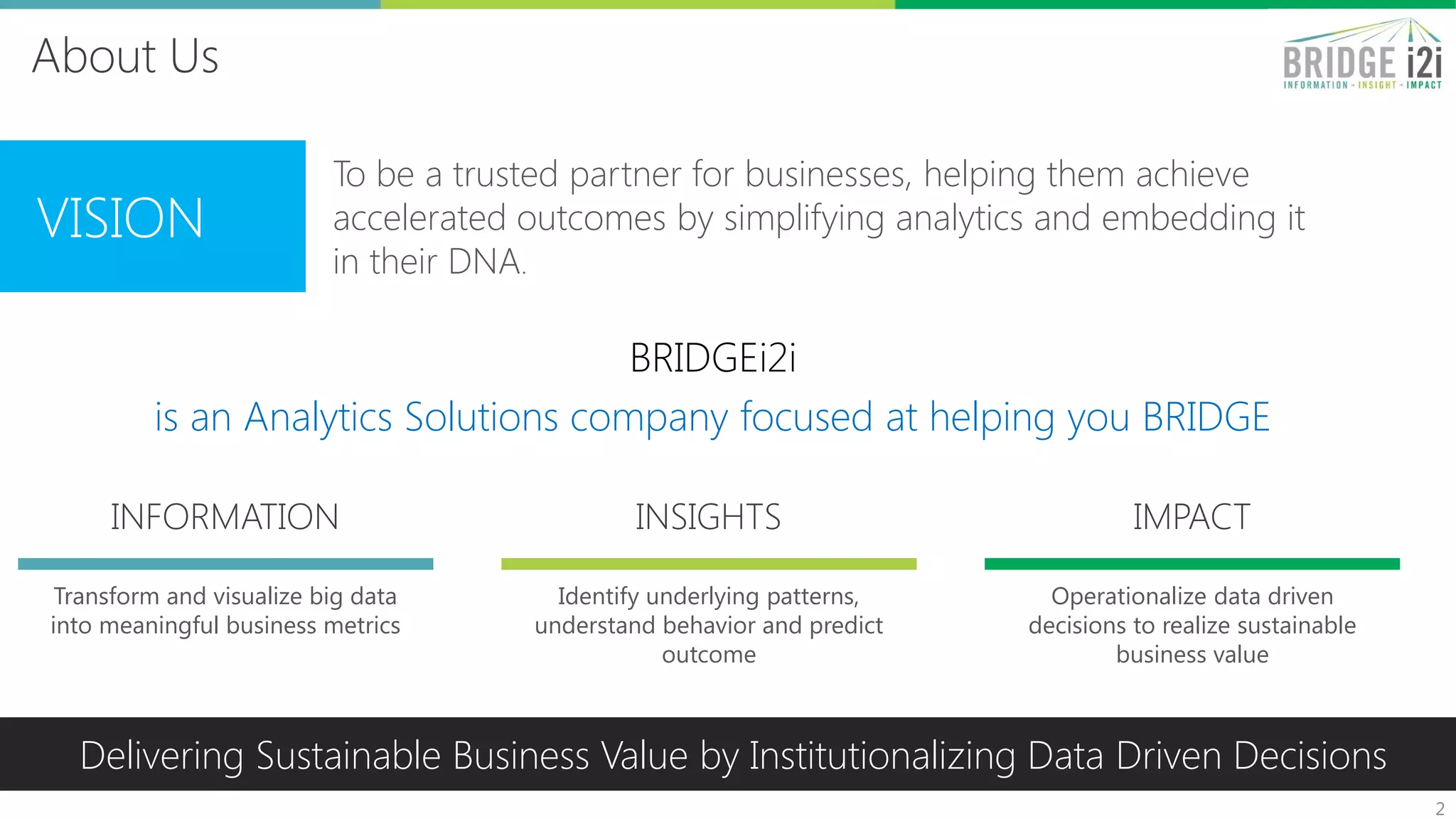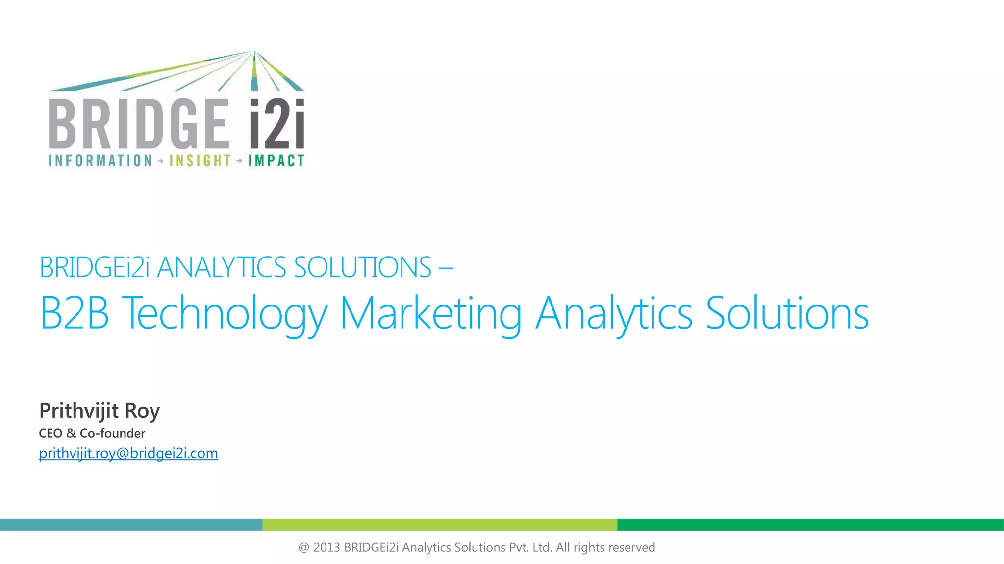This document provides an overview of BRIDGEi2i Analytics Solutions Pvt. Ltd., a company that provides business-to-business technology marketing analytics solutions. It discusses BRIDGEi2i's vision of helping businesses achieve accelerated outcomes by simplifying analytics and embedding it in their operations. The document outlines BRIDGEi2i's capabilities in areas like market intelligence, customer intelligence, marketing effectiveness, price optimization, and more. It also provides details on BRIDGEi2i's leadership team and client portfolio.