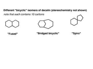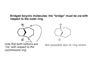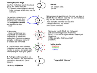 This document discusses nomenclature for bridgehead heterocycles. It notes that the two carbons forming each bridge will always be cis to each other, and both hydrogens will be on the same side. It also notes that both bridgehead positions are on the same carbon, so bicyclo nomenclature cannot be used, but the process is similar - substitute "spiro" for "bicyclo", insert the two bridge lengths, and use the same suffix as before.