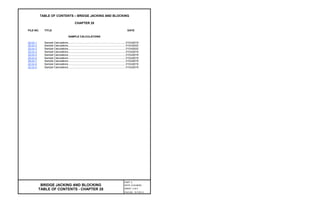 This document serves as a detailed guide for designers and engineers on bridge jacking and blocking systems, outlining structural requirements, load considerations, and procedural guidelines. It covers various scenarios including new bridge designs and maintenance of existing structures, emphasizing the need for proper jacking arrangements and calculations. Additionally, it provides specific information on commercially available jacking cylinders suitable for different jacking situations.