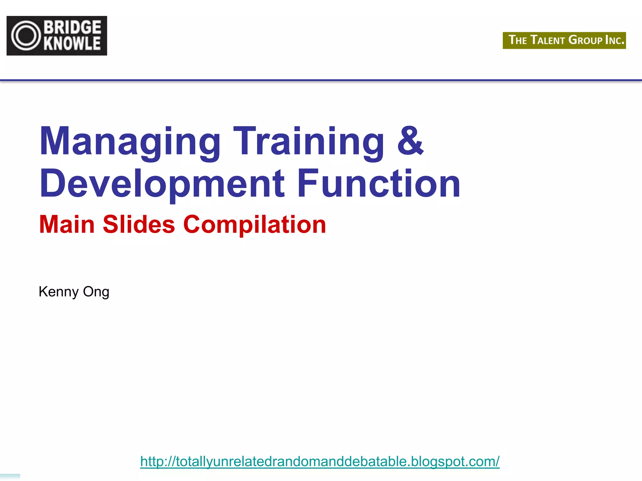 The document discusses various topics related to training and development functions, including: