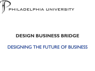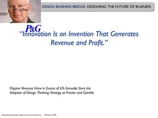 The document discusses a design business bridge program that aims to teach designers business skills. It is structured in modules that cover business models, marketing/management, statistics/operations, and finance. The goal is to empower designers to drive innovation by applying design thinking to technology and business problems. Examples are given of how innovation requires contributions from design, engineering, and business. Key concepts are explored for each module, such as developing business models, customer experience, marketing strategies, supply chain management, and financial statements.