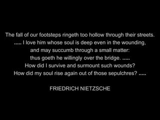 This 3 sentence document discusses the song "Bridge Over Troubled Water" by Simon and Garfunkel and includes a quote from Friedrich Nietzsche. The quote reflects on how the soul can rise again after wounds and surviving hard times, like crossing a bridge over troubled waters. The document was revised by Henry and contains ellipses indicating omitted text.