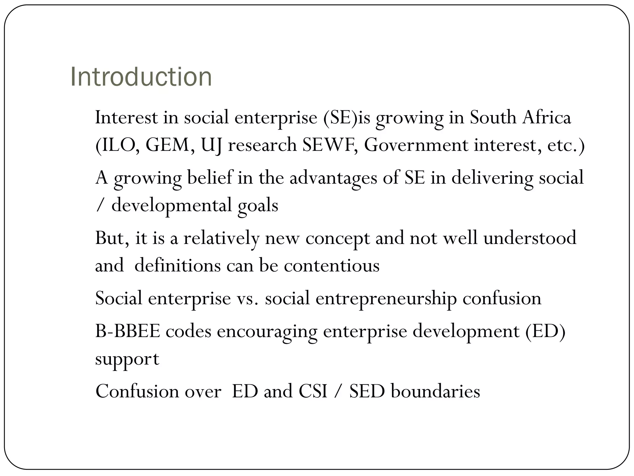 The document discusses the growing interest in social enterprise development in South Africa, highlighting its potential to address social problems through sustainable business models. It outlines the current landscape, challenges, and opportunities for social enterprises, including the lack of a clear definition and support mechanisms. Various stakeholders, including government and organizations, are encouraged to enhance understanding and funding for social enterprises to maximize social impact.