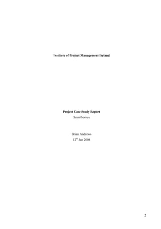 The document is a project case study report detailing the operations and management practices of Smarthomes, a company specializing in smart home technology, based in Dundalk, Ireland. It describes the project management culture, processes for scope, time, cost management, and human resources involved in their projects, especially focusing on a structured cabling system installation in a shopping complex. The report emphasizes the strong organizational project management culture and systematic procedures for managing projects effectively from initiation through to execution and closure.