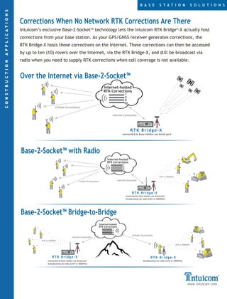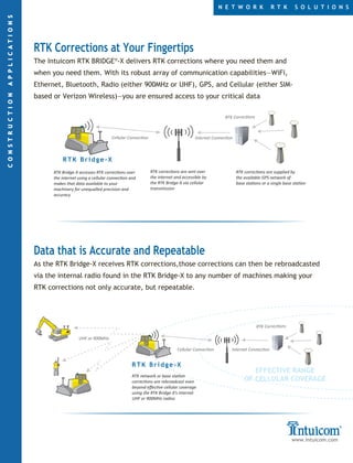 The RTK Bridge-X device receives real-time kinematic (RTK) corrections via cellular network and rebroadcasts them using an internal radio, allowing the corrections to be accurate and repeatable for multiple machines. It delivers RTK corrections to areas with no cellular coverage by hosting corrections from connected base stations on the internet. The device has various communication capabilities including radio, cellular, WiFi and Bluetooth to ensure access to corrections.