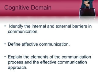 This document provides information on effective communication skills. It discusses the cognitive, behavioral and affective domains of communication. It explains key elements of the communication process like the sender, message, receiver and feedback. It also identifies internal and external barriers to communication. The document emphasizes important communication skills like active listening, paraphrasing and clarifying. It discusses the importance of having consistent verbal and non-verbal communication and explains how effective communication is important for relationships and reducing wasted time and energy. Examples of congruent verbal and non-verbal communication are also provided.