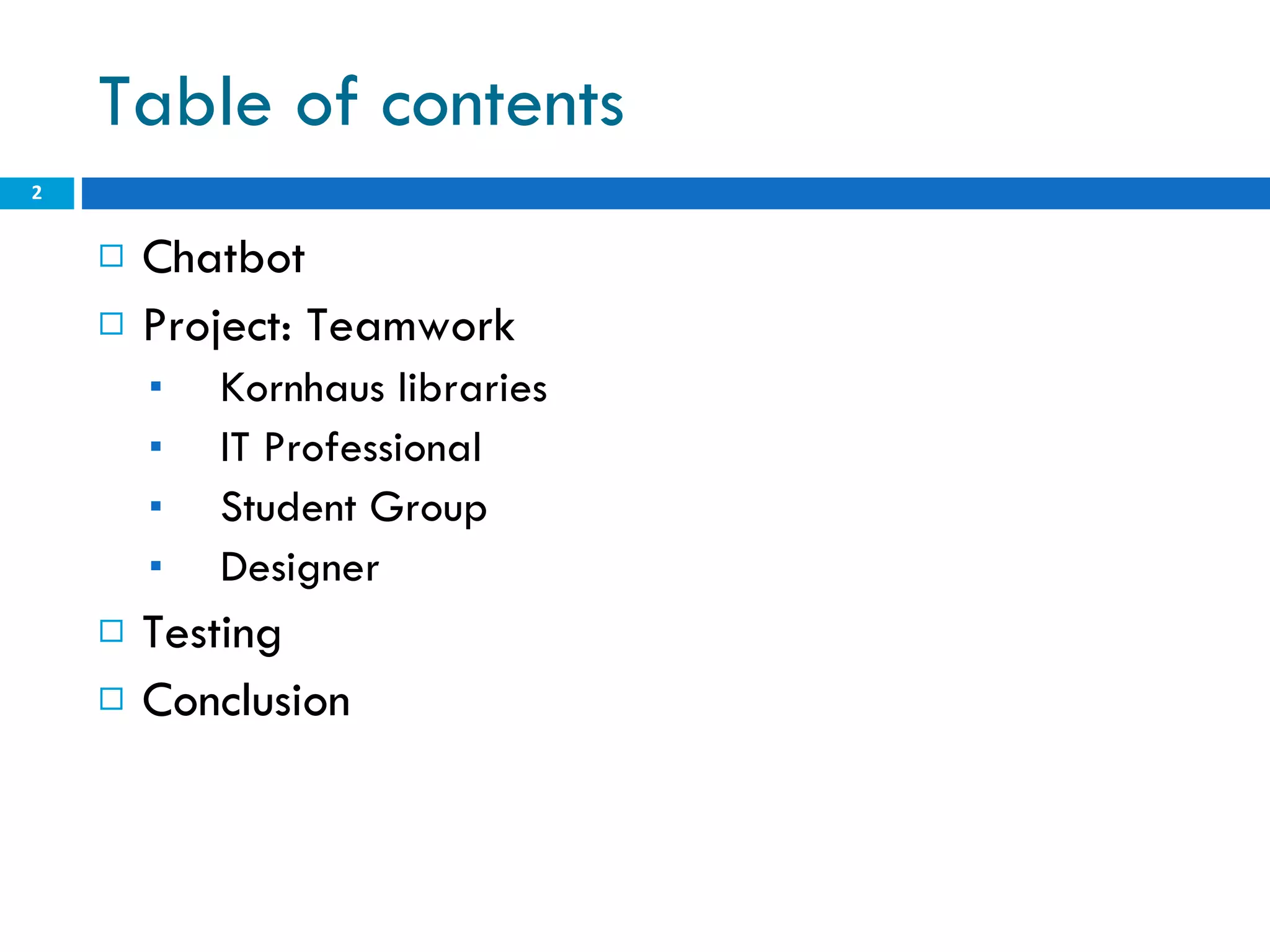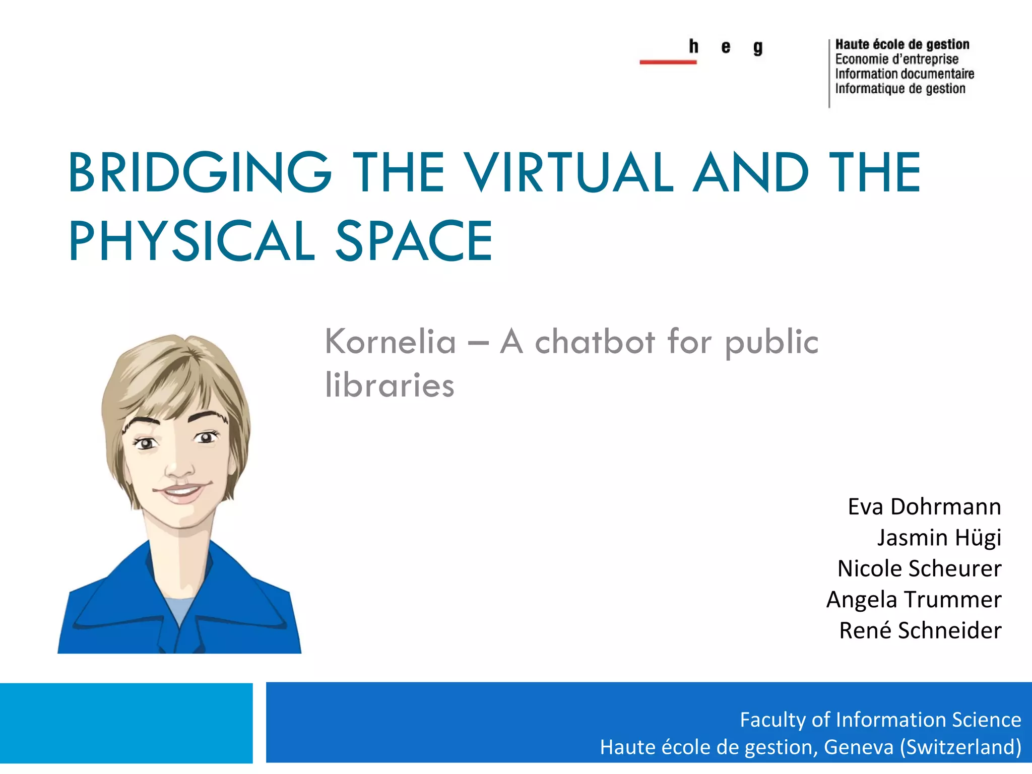 The document discusses the development of Kornelia, a chatbot for the Kornhaus public libraries in Bern, Switzerland. A team including students, an IT professional, and a designer worked to create Kornelia to bridge the gap between libraries and digital users. The team developed Kornelia using Program E and the AIML language. She was tested internally and with users to improve her knowledge and usability over time. Kornelia has been online since July 2009 to help answer questions about the Kornhaus libraries.