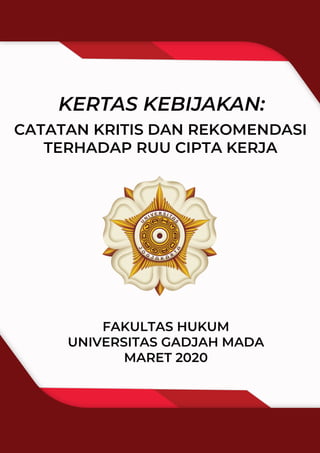 Dokumen ini adalah catatan kritis dan rekomendasi dari Fakultas Hukum Universitas Gadjah Mada tentang RUU Cipta Kerja yang diajukan pemerintah Indonesia pada Februari 2020, yang mengidentifikasi berbagai permasalahan penting dalam sebelas bidang kebijakan. Temuan utama mencakup potensi hilangnya otonomi daerah akibat sentralisasi perizinan, serta penghapusan persyaratan penting terkait investasi dan ketenagakerjaan yang dapat merugikan masyarakat. Tim merekomendasikan agar RUU ini ditarik kembali dan disusun ulang dengan melibatkan partisipasi masyarakat yang lebih luas untuk mencapai prinsip pembangunan berkelanjutan.