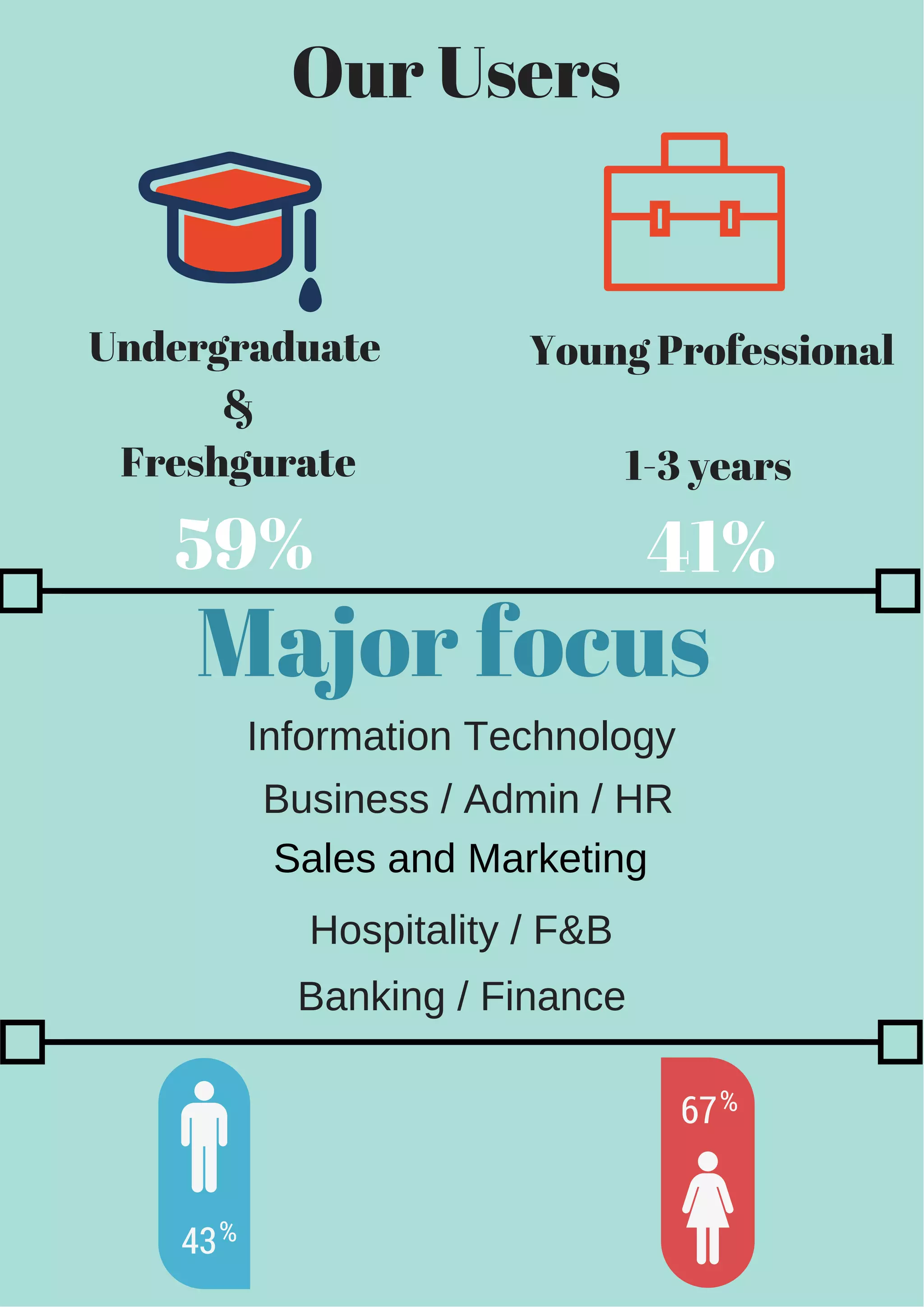 This document discusses a recruitment platform targeting young talents. It has over 4,000 registered users with the majority being undergraduates and fresh graduates between 1-3 years of professional experience. The platform's major focuses are business, IT, sales, hospitality, and banking. It has placed over 350 candidates from 76 companies through 50,000 weekly pageviews and 1,000 daily unique visitors. In addition to its online job searching, it also helps organize offline career workshops, talks, and company visits to gain more exposure.