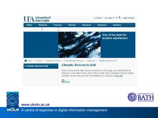 The document presents an extensive overview of digital preservation, including its challenges, foundational models like the OAIS reference model, and principles for effective management of digital content. It outlines various preservation strategies, such as technology preservation and migration, and focuses on concrete examples like email and website preservation. Additionally, it emphasizes the importance of metadata, ongoing monitoring, and the establishment of organizational policies for successful digital curation.