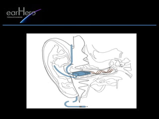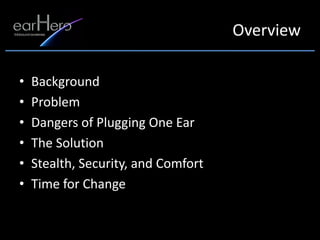 The document discusses the dangers of traditional coiled tube radio systems that force users to plug one ear. This reduces binaural awareness and the ability to localize sounds. The solution presented is the earHero, which uses small micro speakers placed in the ear canal to allow the user to hear the radio and their surroundings simultaneously and binaurally. The earHero offers stealth, security, comfort, and gives users in sensitive fields every advantage through improved spatial awareness.