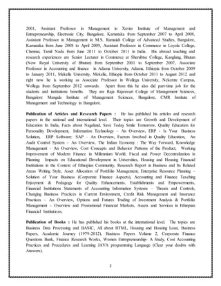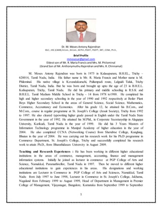 Dr. M. Moses Antony Rajendran's biography provides details of his educational and professional background, including obtaining a PhD in Commerce from Bharathidasan University in 2009. He has over 18 years of experience teaching and conducting research in India, Bhutan, and Ethiopia. The document outlines his areas of specialization, publications, administrative experience, and travels.