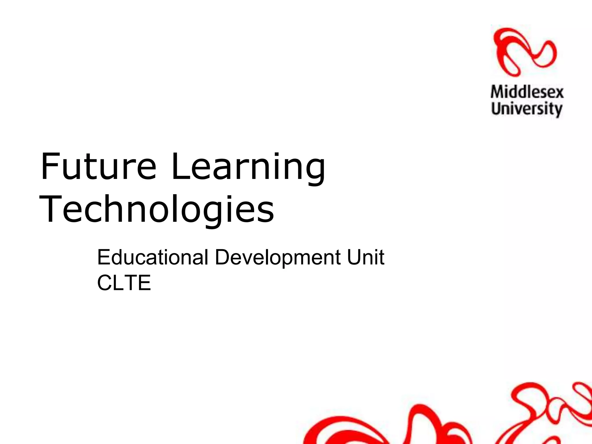 The document discusses reviewing learning technologies at the university, particularly the virtual learning environment Oasisplus, with an eye toward the future. It notes current technologies like social networking, podcasting, and personal learning environments. The future may include changes to student numbers, overseas expansion, increased e-assessment and distance learning. A scoping exercise will gather requirements to guide selection of new technologies, with opportunities for input through a wiki and online discussion board.