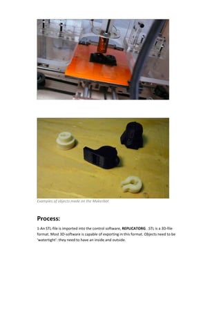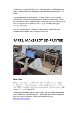 This document provides information about the machines that will be used in an open-source 3D printing and milling workshop. It describes the Makerbot 3D printer and Timelab's miniCNC milling machine, including the file formats and parameters that can be used with each machine. Instructions are provided for installing the necessary software, and examples are given of objects that can be printed or milled.