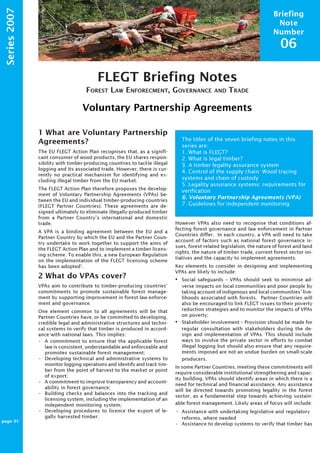 Voluntary Partnership Agreements (VPAs) are agreements between the EU and timber-producing countries to help eliminate illegal logging. Under a VPA, a country agrees to develop a licensing system to verify legally harvested timber and improve forest governance. The VPA will cover establishing verification of legal timber, improving transparency, and building systems to issue export licenses. A joint committee oversees each VPA's implementation and progress. VPAs aim to improve forest management over time through capacity building and reforms supported by the EU.