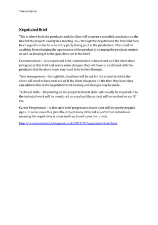 The document describes several types of briefs used in contractual agreements between clients and production companies for creative projects. A contractual brief outlines the work to be done, expectations of the client, and payment terms. A negotiated brief allows the client and producer to discuss and potentially modify the project scope and guidelines. A formal brief provides guidelines from the client for the project but does not necessarily constitute a legally binding agreement.