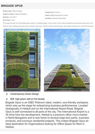 The document describes Brigade Opus, an office complex in Hebbal, Bangalore. It has several key features including a 82 foot tall green wall on the northern facade made of 15,750 plants, making it one of the tallest green walls in the country. The complex aims to provide a sustainable, modern workplace with amenities like landscaped gardens and cafeterias to support businesses.