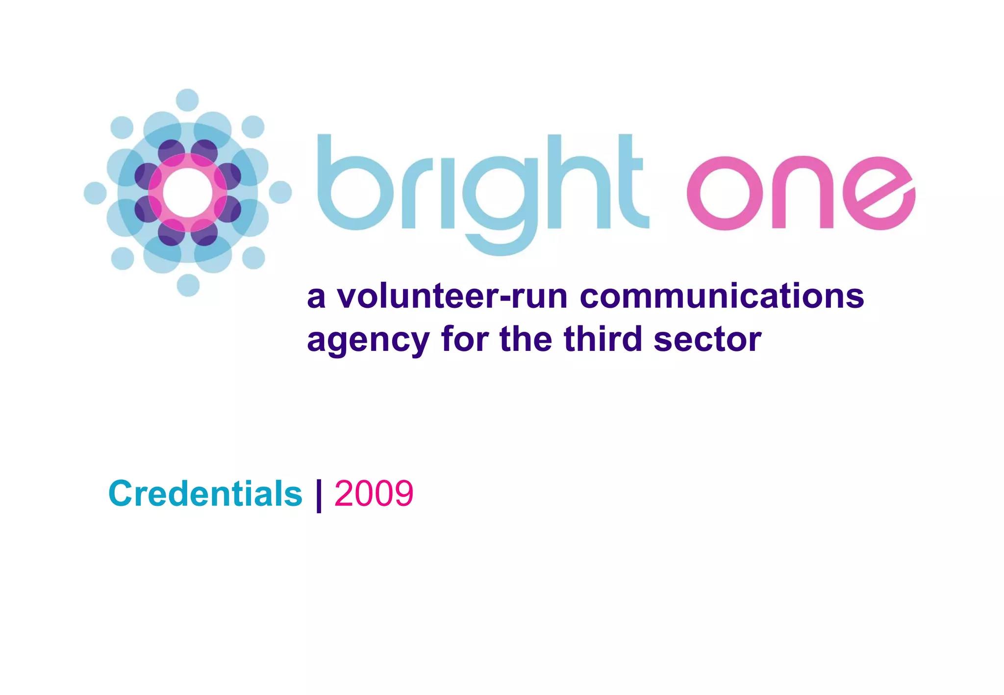 Bright One is a volunteer-run communications agency that offers affordable communications programs and public relations services to nonprofit organizations. It helps nonprofits raise awareness of their initiatives through services like media relations, social media consulting, and event planning. Volunteers gain hands-on experience working with experienced communications professionals on client projects.