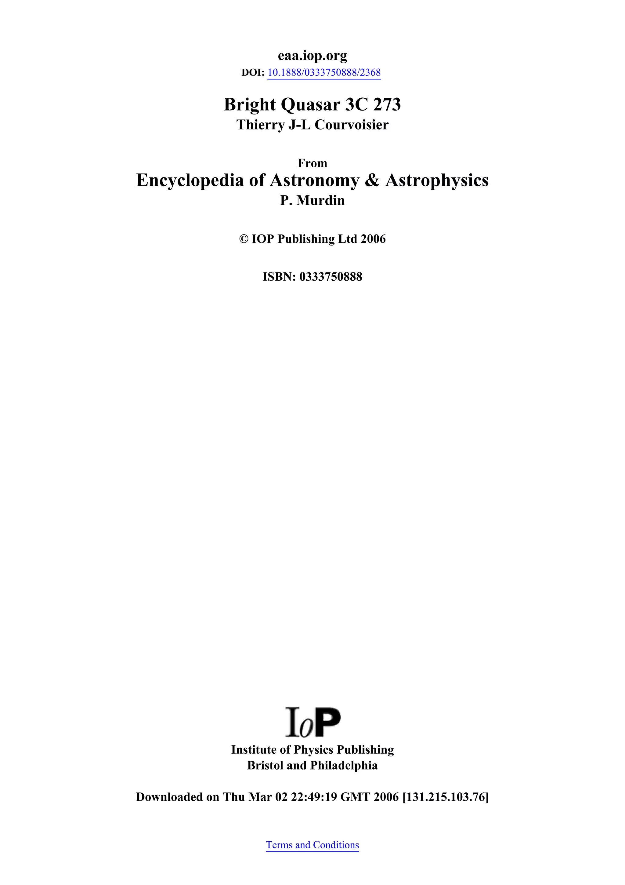 3C 273 was one of the first quasars discovered in 1963. It remains one of the brightest and best studied quasars. It is located approximately 3 billion light years from Earth and radiates energy equivalent to 1014 times the luminosity of the Sun. 3C 273 plays a key role in understanding the nature of quasars as powered by accretion disks around supermassive black holes. It continues to be intensely observed across the electromagnetic spectrum to better understand the physics occurring in these energetic and distant cosmic objects.