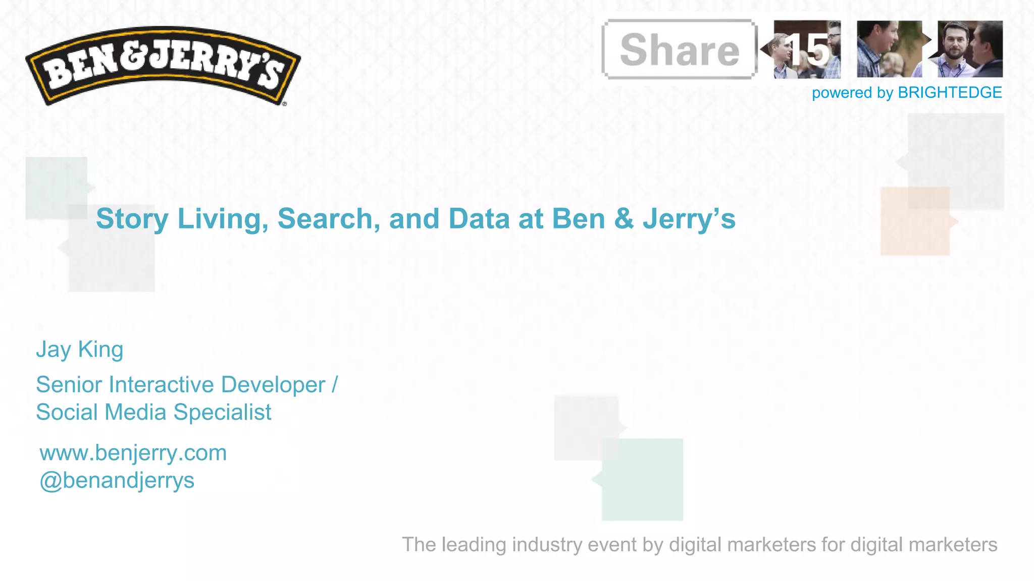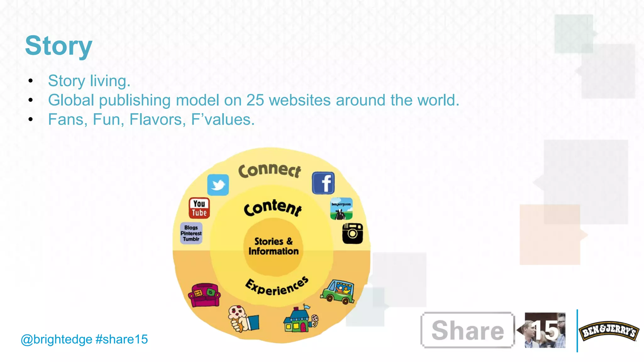The document discusses Ben & Jerry's approach to search engine optimization and content strategy. It describes how Ben & Jerry's uses data from the BrightEdge platform to inform its content creation, publishing, and social sharing. Key metrics show that organic search drives about 50% of Ben & Jerry's web traffic and that content optimized for search leads to longer visitor engagement times and more "super visitors" who view deep page content. The document advocates balancing data insights with brand priorities in content and emphasizes educating stakeholders about SEO as a cross-functional effort.