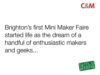 The document discusses the campaign to promote the first Brighton Mini Maker Faire event in September 2011. It provides context about Maker Faires and outlines the goals, plan, outcomes, assets and key activities of the campaign, which included generating media coverage, building social media engagement, and attracting both makers to participate and visitors to the event. The campaign was successful in significantly exceeding its participation and attendance goals as well as achieving widespread coverage and positive sentiment around the inaugural Brighton Mini Maker Faire.