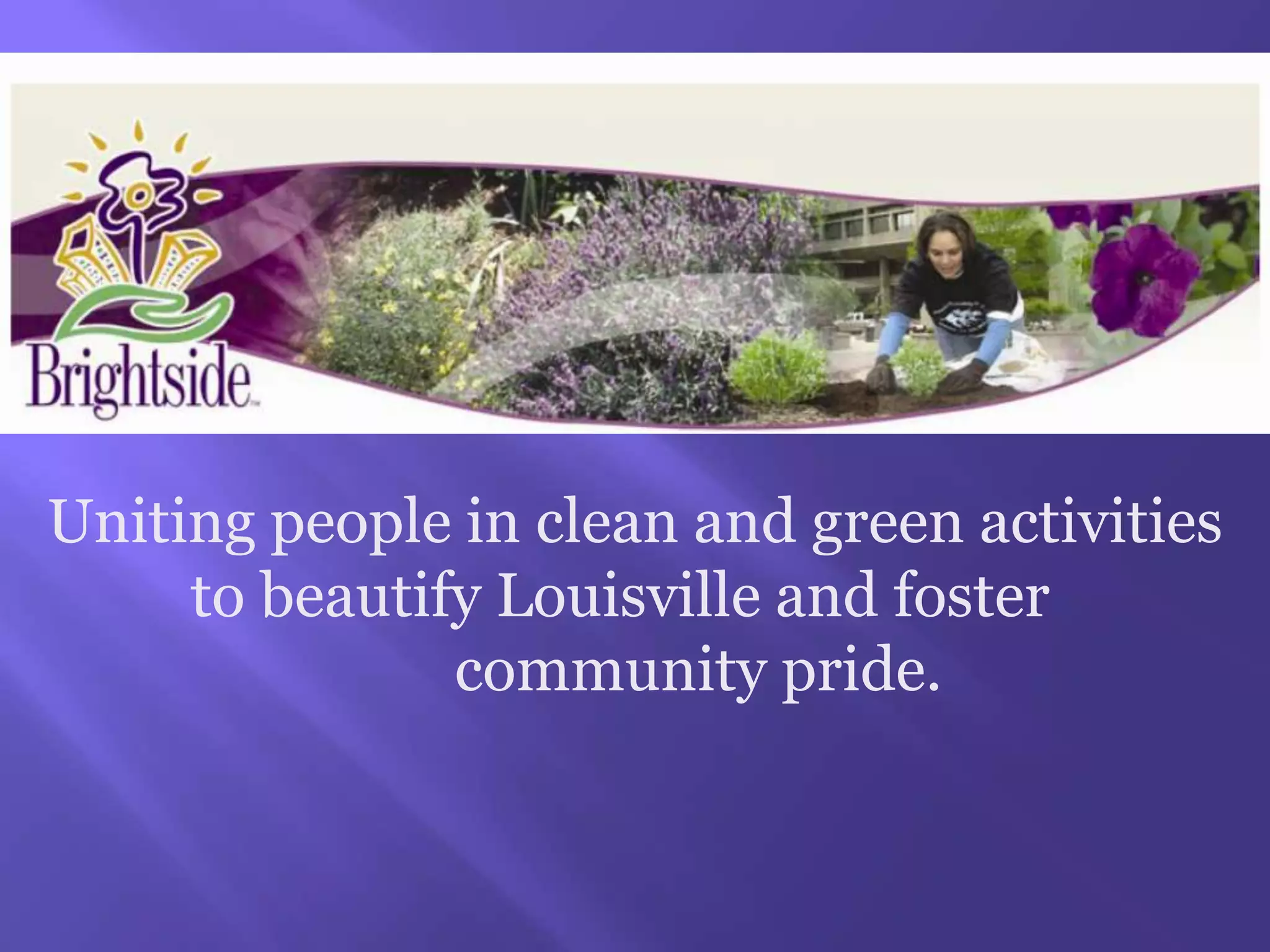 Brightside is a non-profit organization in Louisville focused on beautifying the city through community cleanups and environmental education programs. With a small staff and over 22,000 volunteers annually, Brightside organizes youth programs, neighborhood cleanups, urban greening projects, and community events. These efforts save the city $800,000 per year while bringing residents together to care for the environment and public spaces.