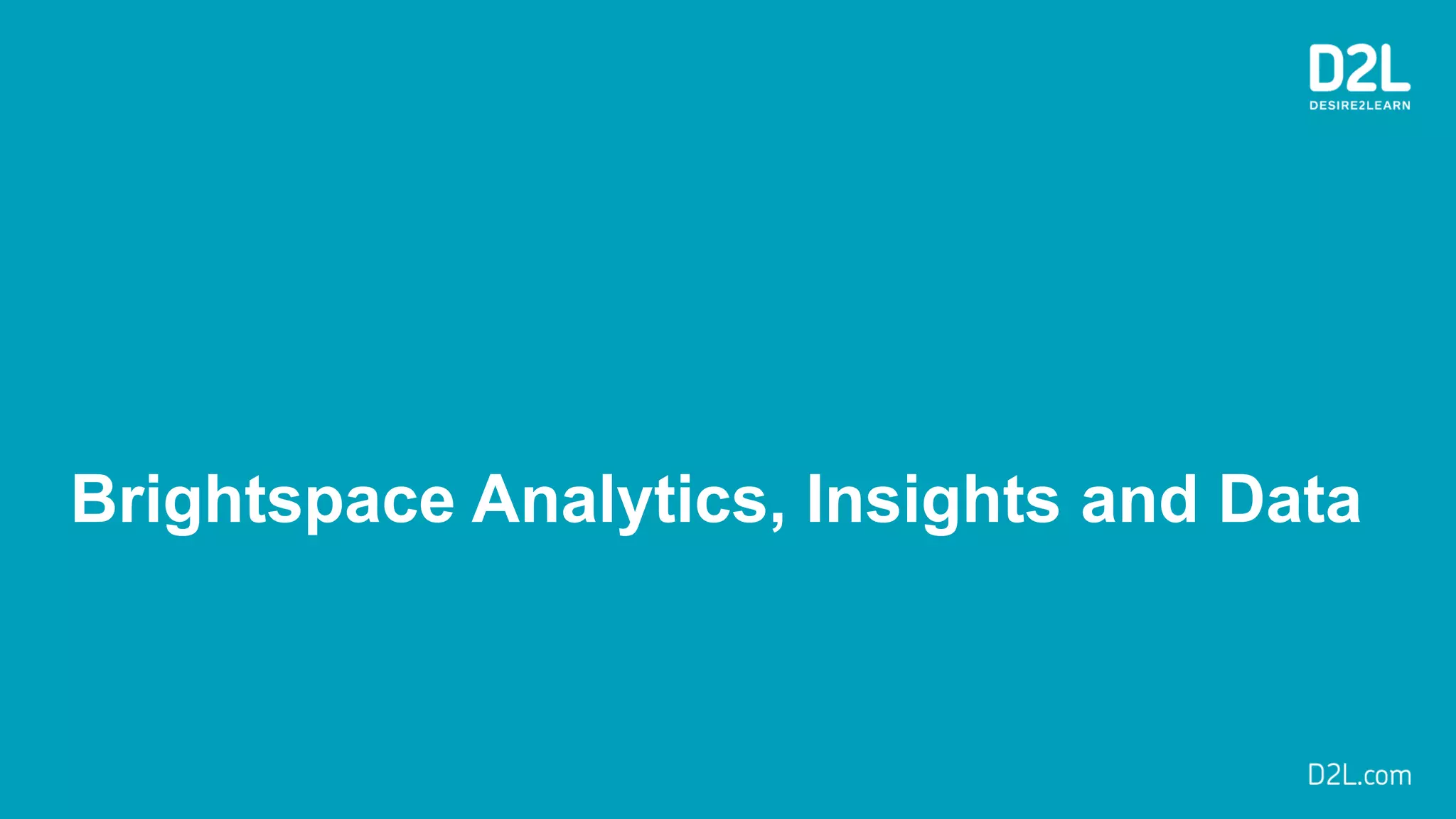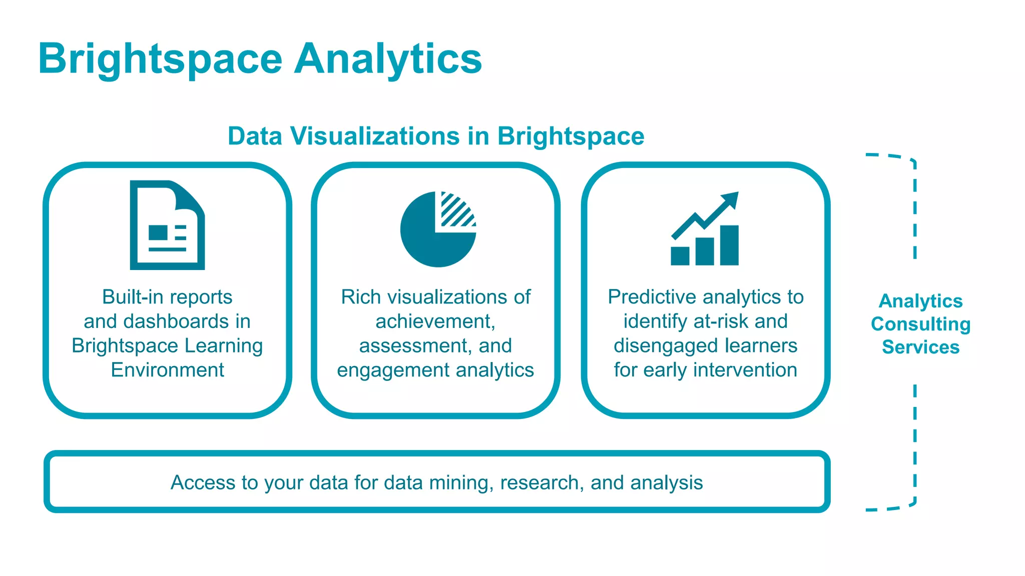 The document outlines Brightspace Analytics, which provides tools for data mining, research, and analysis within the Brightspace learning environment. It includes built-in reports, dashboards, predictive analytics for identifying at-risk learners, and various assessment and engagement analytics features. Additionally, it highlights the availability of raw user-level data through the Data Hub for research and custom reporting.