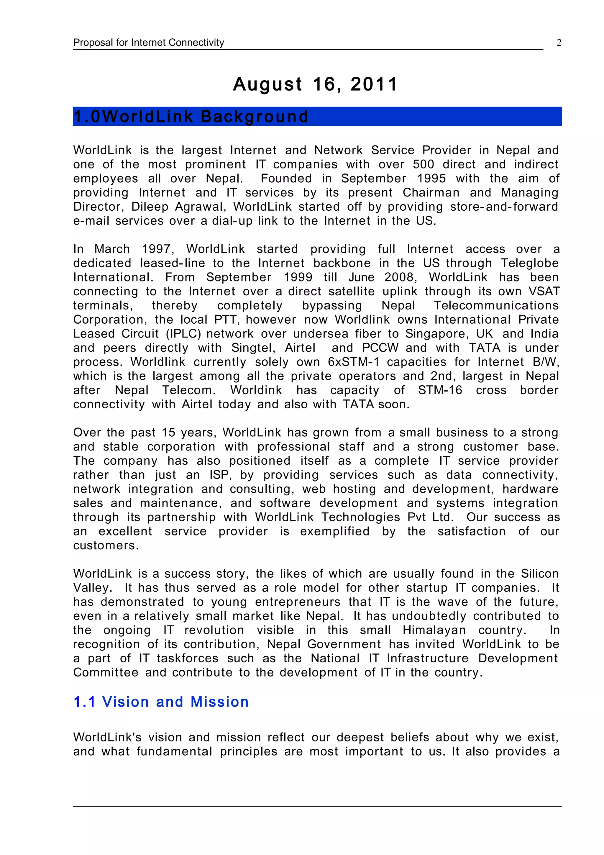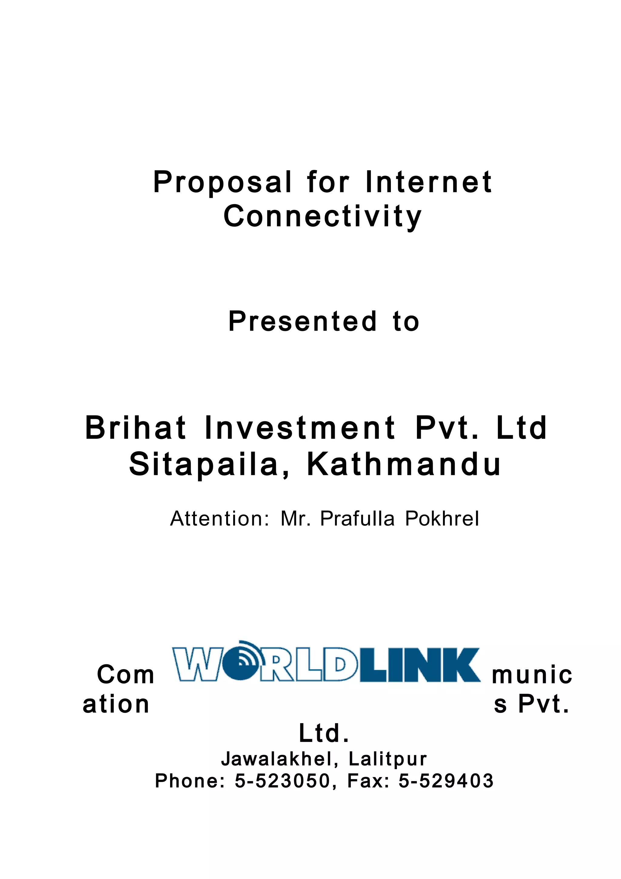 WorldLink is proposing internet connectivity to Brihat Investments Pvt. Ltd. WorldLink is Nepal's largest internet service provider with over 500 employees. It owns its international private leased circuit network and has points of presence throughout Nepal, including 15 locations outside of Kathmandu. WorldLink aims to provide reliable, high quality internet access and is ISO9001 certified for its quality management system.