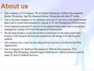 B.R Info Solution is an IT company specializing in digital marketing, website and app development, and content writing. The company aims to provide innovative IT services and solutions to clients globally while leveraging digital marketing techniques to enhance customer engagement and brand awareness. With a team of skilled professionals, the company focuses on delivering quality services in various IT domains, including search engine optimization and social media marketing.