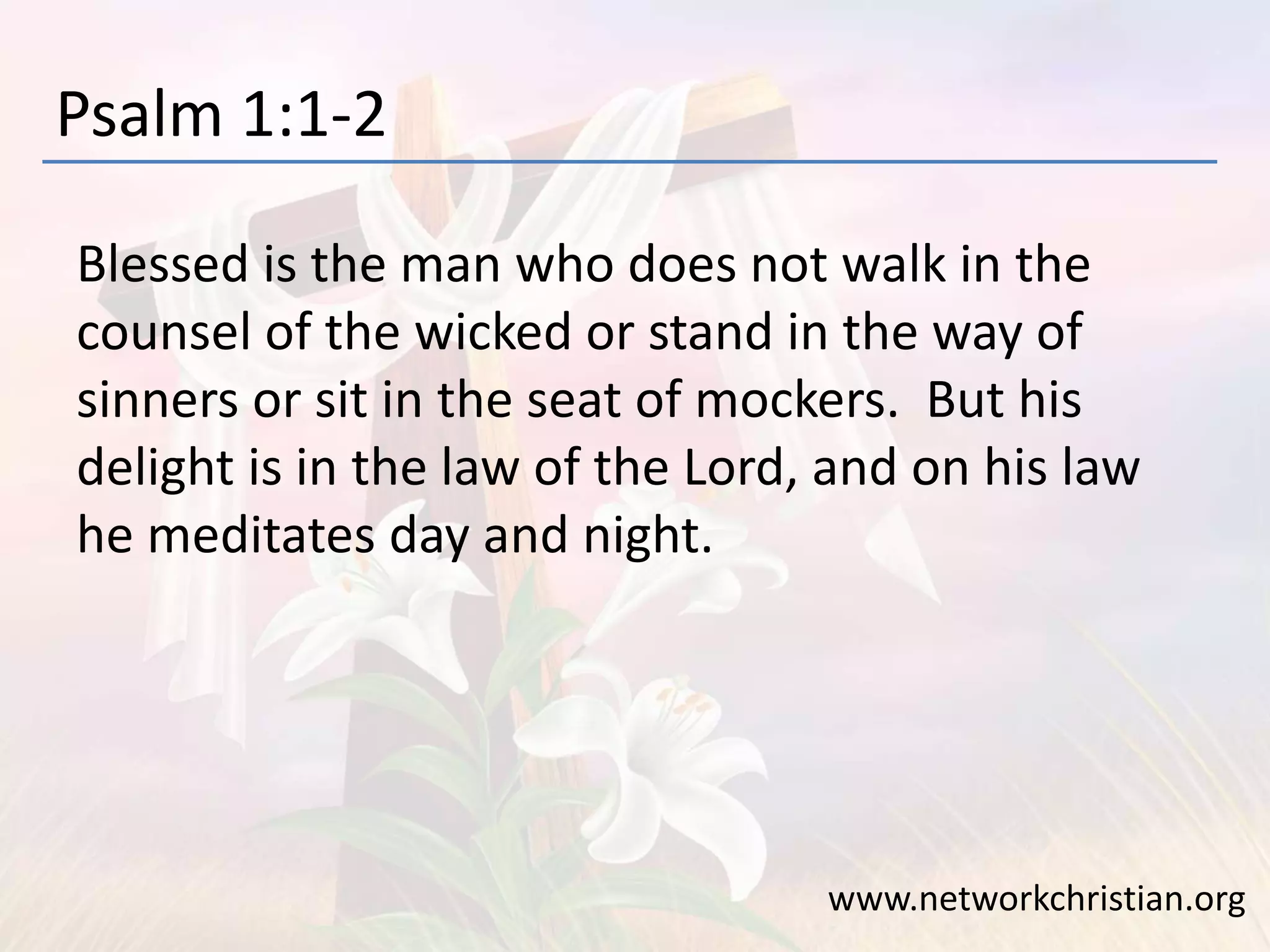 Psalm 1 emphasizes the contrast between the righteous and the wicked, illustrating that the righteous, who delight in and meditate on God's law, are prosperous like a fruitful tree, while the wicked are compared to chaff that shall perish. It encourages believers to love God with their minds, choose their influences wisely, and reflect on their relationship with Him. The document concludes with a call to action for personal evaluation and commitment to spiritual growth.