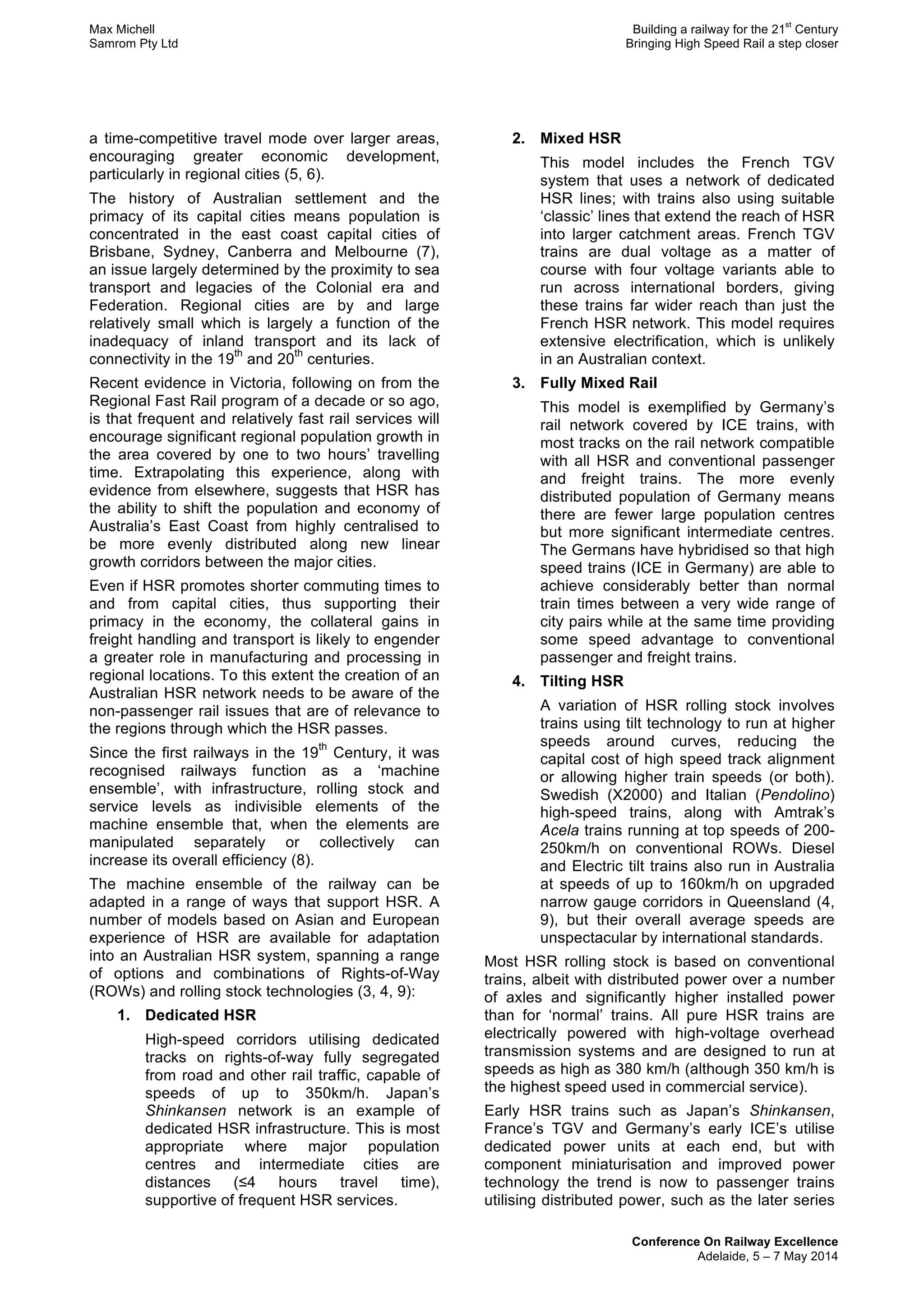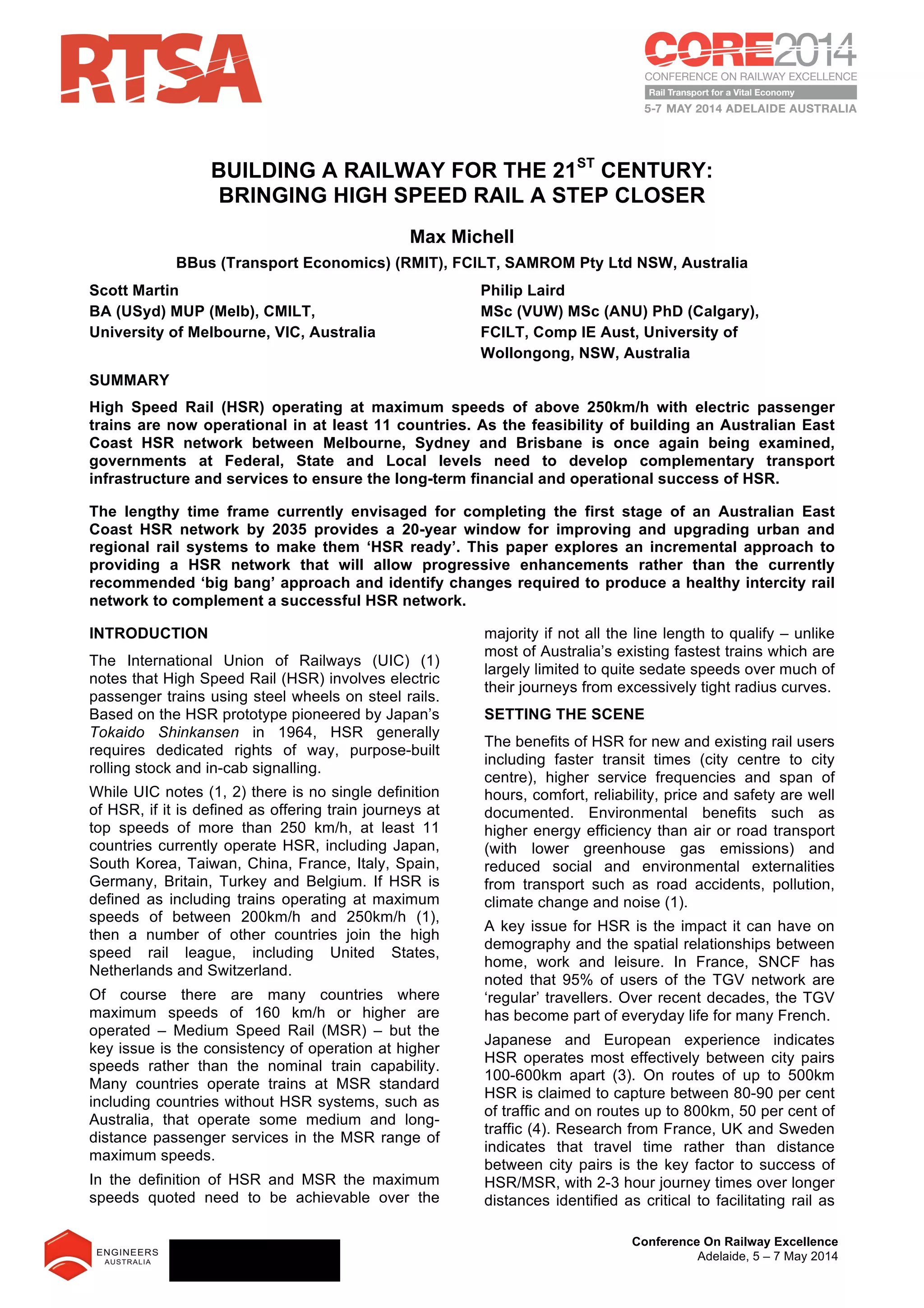 The document discusses the feasibility and developmental strategies for establishing a high-speed rail (HSR) network along Australia's east coast, connecting Melbourne, Sydney, Brisbane, and Canberra. It highlights the operational models of HSR in various countries and explores incremental approaches to upgrading existing rail systems to support such a network. The analysis emphasizes the potential economic and social benefits, alongside the current status and challenges of rail transport in Australia.