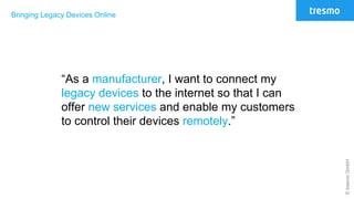 Gateways can connect legacy devices to the internet by translating between the device's protocols and IoT protocols. A gateway identifies the connected device and receives its datapoint definitions from the cloud. A semantic data model maps different devices' raw datapoints to standardized values to simplify access by applications.