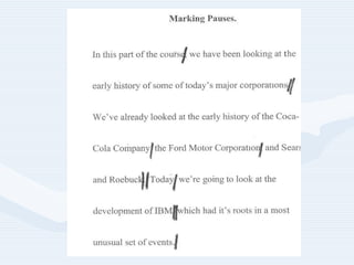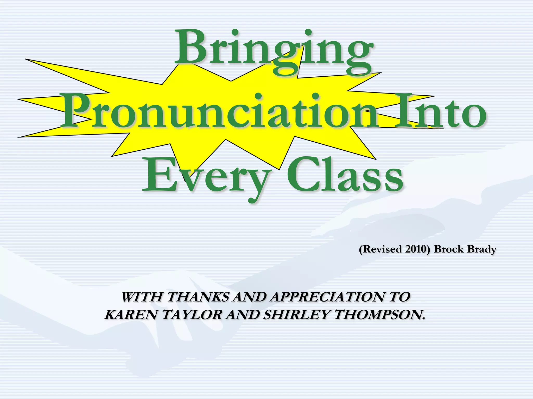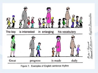 This document provides guidance on bringing pronunciation into English language classes. It discusses the importance of pronunciation for student confidence and outlines some key pronunciation features to address, such as intelligibility, comprehensibility, and accents. The document recommends focusing first on suprasegmentals like stress, rhythm, intonation, and linking as these provide the most benefit. It provides techniques for practicing suprasegmentals like using rubber bands to mark stress or dots and lines on words. General classroom techniques are also outlined, such as having students listen before seeing text, linking words, and correcting pronunciation "on the fly" with modeling.
