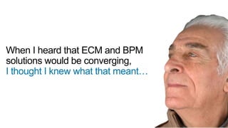The document outlines various business process solutions aimed at improving efficiency through content integration, automation, and better management of information. It includes strategies for capturing and transforming documents, automating workflows, accessing legacy systems, and delivering better customer engagement. Additionally, it emphasizes the importance of collaboration, compliance, and governance within organizations to enhance process design and performance.