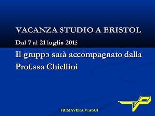 La vacanza studio a Bristol si svolgerà dal 7 al 21 luglio 2015, con accompagnamento della prof.ssa Chiellini. Gli studenti soggiorneranno al Clifton College, partecipando a un corso di inglese di 15 ore settimanali e diverse escursioni. La quota di partecipazione varia da €2.350 a €2.450 a seconda della data di iscrizione e include il volo, sistemazione, pasti e attività.