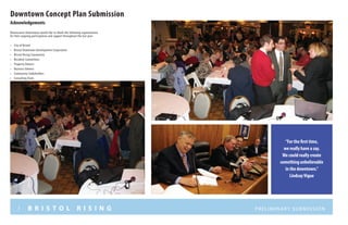 The document outlines a revitalization plan for downtown Bristol, Connecticut, emphasizing community involvement and collaboration among various stakeholders. It identifies Bristol's rich history and existing assets as a foundation for creating a vibrant mixed-use urban area that meets the needs of modern populations. The plan aims to leverage demographic trends and shifting consumer preferences towards urban living to foster economic and social growth in the community.
