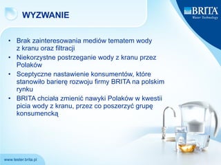 Projekt polegał na wzmocnieniu świadomości marki BRITA poprzez przeprowadzenie kampanii, której celem jest budowanie zaufania do wody kranowej, a w konsekwencji zachęcenie Polaków do picia przefiltrowanej wody kranowej. Kampania polegała na wypromowaniu nowego zawodu BRITA Tester wody oraz przeprowadzeniu ogólnopolskich badań jakości wody, które obalą głęboko zakorzenione stereotypy dotyczące wody kranowej.