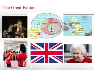 Great Britain refers to the island of Great Britain and surrounding smaller islands. It has a population of around 61 million and is part of the United Kingdom. The main languages spoken in Great Britain are English, Welsh, and Scottish Gaelic. Some cultural aspects discussed in the document include British greetings like handshakes, British currency, British food, festivals and holidays celebrated, and the importance of sports in British culture. The document also provides information on British government, cities, jobs, marriage customs, and general superstitions in Great Britain.