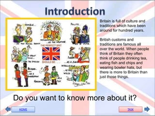 This document outlines a project for students to learn about aspects of British culture by researching topics in groups. It provides instructions for students to: 1) form groups and be assigned topics related to British symbols, festivals, sports, food, etiquette, the royal family, government, and tourism tips; 2) individually research their topic using provided links; 3) share information in their groups to create a presentation; and 4) present their topic to the class. The goal is for students to understand and compare British culture to their own.