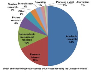 The British Museum's online collection, launched in 2007, has expanded to over 2 million records, with significant user engagement metrics recorded. A survey conducted in 2010 revealed user demographics, preferences, and suggestions for improvement, highlighting needs for better search facilities and more images. Findings from the survey will inform a user-centered redesign set to launch in early 2013.