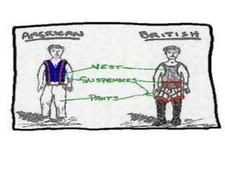 This document provides a comparison of British and American vocabulary related to clothing, transportation, buildings, and miscellaneous words. It lists terms that have different meanings or names between the two dialects of English. For example, trousers are called pants in American English, a vest is called an undershirt, and a flat is called an apartment. Transportation terms like bonnet, boot, and indicators are also translated. The document aims to reduce confusion by explaining linguistic differences between British and American English.
