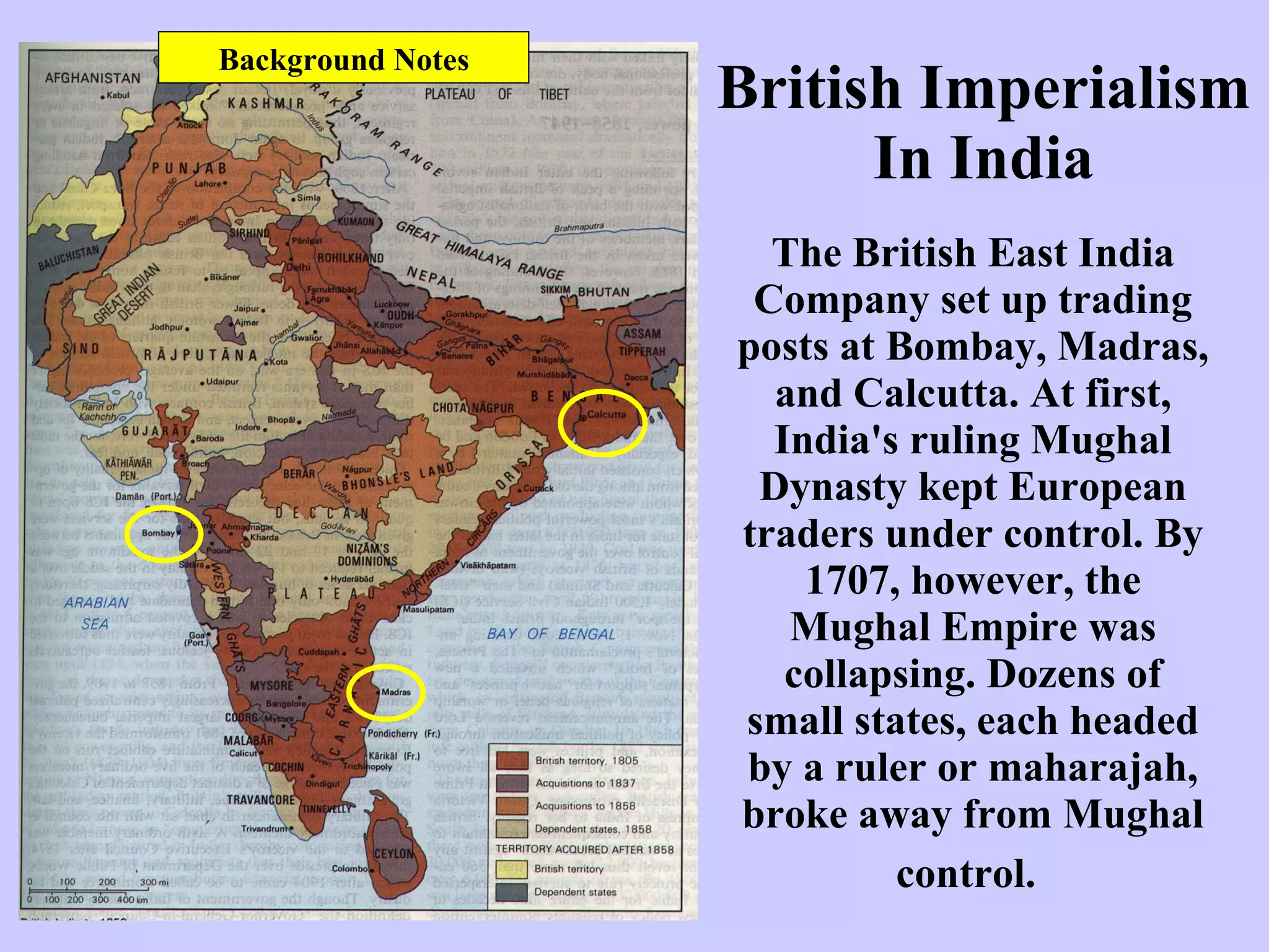 The British East India Company gradually expanded its control over India as the Mughal Empire declined in the 1700s and 1800s. Key events included Robert Clive's victory over the Nawab of Bengal at the Battle of Plassey in 1757, which established Company rule in Bengal. The Company exploited India's resources and restricted its industry. This caused economic problems and famines. It also modernized India through infrastructure projects and education. However, British policies disrespected Indian culture and oppressed the Indian people, leading to the Sepoy Mutiny against the Company in 1857.