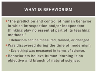 This document provides an overview of behaviorism. It defines behaviorism as predicting and controlling human behavior through objective measurement and without consideration of internal mental states. Key figures discussed are Ivan Pavlov, known for classical conditioning experiments with dogs, B.F. Skinner who developed operant conditioning through reinforcement techniques with pigeons, and Albert Bandura who studied social learning and observational modeling. The document also outlines classroom implications of behaviorism through operant conditioning with rewards and punishments.