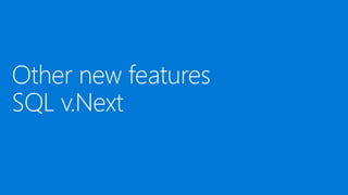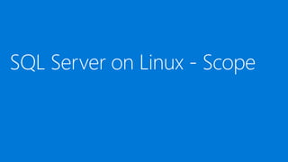 - The document outlines SQL Server's capabilities on Linux such as high availability, security, and tools/drivers available now or in development.