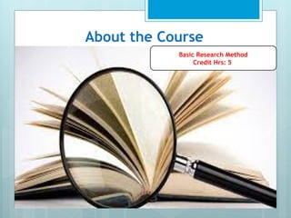 The document outlines a course on Basic Research Method taught by Abdirahman M. at the Somaliland Civil Service Institute, covering key concepts in research methodology, design, and assessment methods. It includes topics such as types of research, qualitative vs. quantitative approaches, and the components of a research thesis. The course aims to equip students with the necessary skills for conducting their own research projects.