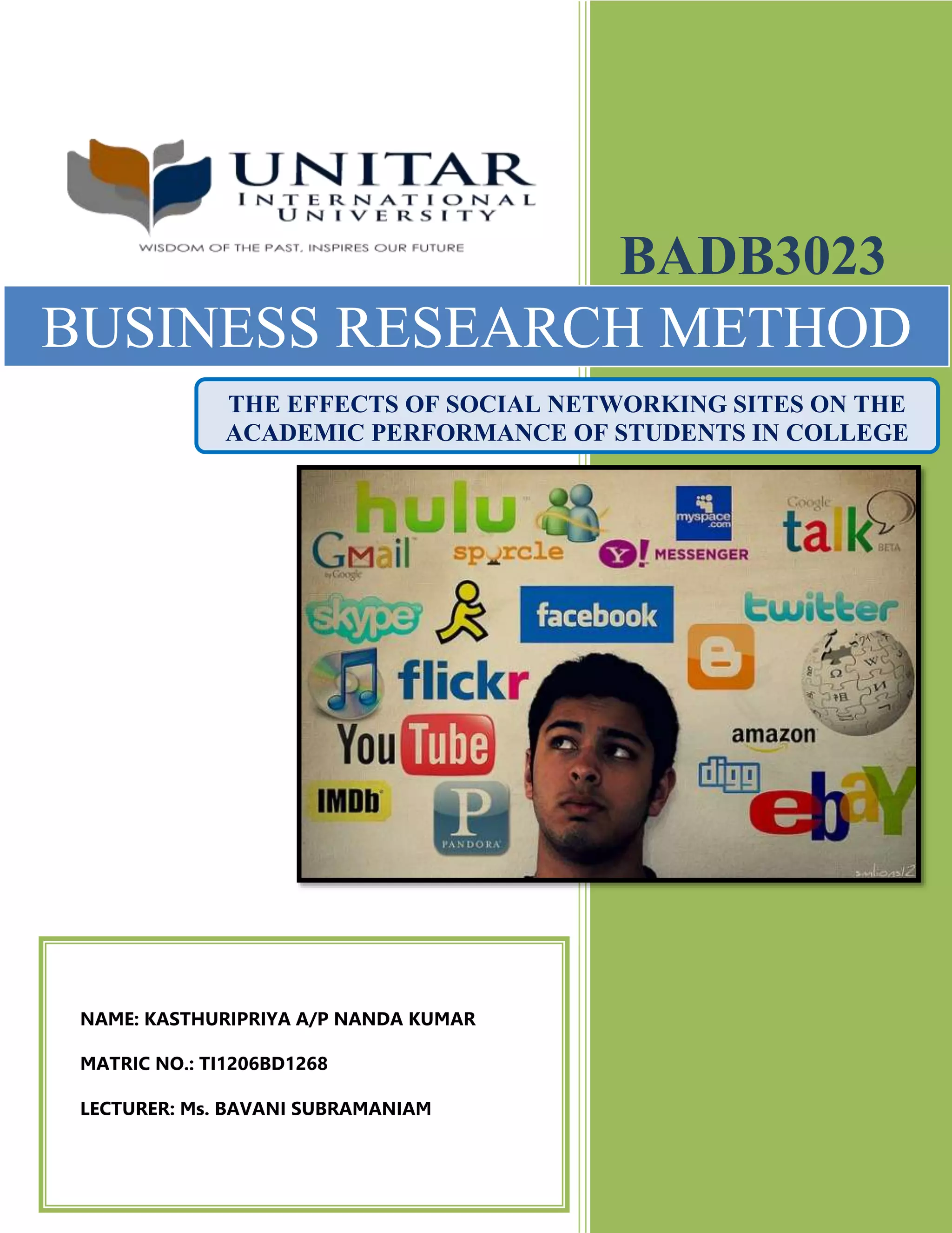 This document is a research paper that examines the effects of social networking sites on the academic performance of college students. It begins with background information on the rise of social networking and introduces the research problem of whether these sites impact students' grades. The purpose is to determine this impact through a study of 30 students at Taj International College. A literature review discusses previous research, which has found mixed results on whether time spent on social networking correlates with academic performance.