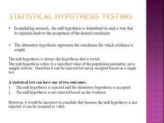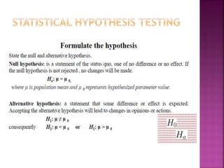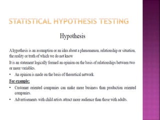 This document provides an overview of key concepts in data analysis and statistics. It defines different types of data (categorical, continuous) and variables (nominal, ordinal, interval, ratio). It then covers various steps in data analysis including data preparation, summarization, and descriptive and inferential statistical methods. Graphical representations like pie charts, bar graphs, histograms and scatter plots are also discussed. Hypothesis testing concepts like null/alternative hypotheses, p-values, and choosing test statistics based on data type are summarized.
