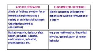 This document provides an overview of business research methods. It discusses why business research is important for engineers and defines what research is, including that it is a systematic search for truth and new knowledge. It outlines the scientific method process and types of research such as descriptive vs analytical, applied vs fundamental, quantitative vs qualitative, and conceptual vs empirical. COVID-19 statistics are also presented along with the current vaccine status.