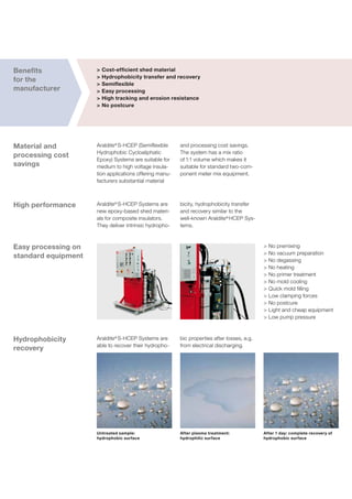 Araldite S-HCEP epoxy systems provide a cost-effective, semiflexible material for composite insulators with benefits like hydrophobicity, easy processing, and high tracking/erosion resistance. It offers material and processing cost savings compared to other options. The epoxy has intrinsic hydrophobic properties and can recover lost hydrophobicity. It can be processed using standard equipment without extra steps like premixing, vacuum prep, degassing, or postcuring. The epoxy adheres well without primers and provides excellent performance in high voltage insulation applications.